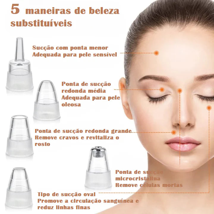 3 níveis de sucção ajustáveis e 5 pontas de sucção intercambiáveis para ajuste na hora do uso, adequadas a diferentes tipos de pele e para uso em diferentes áreas da pele, atendendo plenamente às suas necessidades de limpeza de poros acnes e cravos