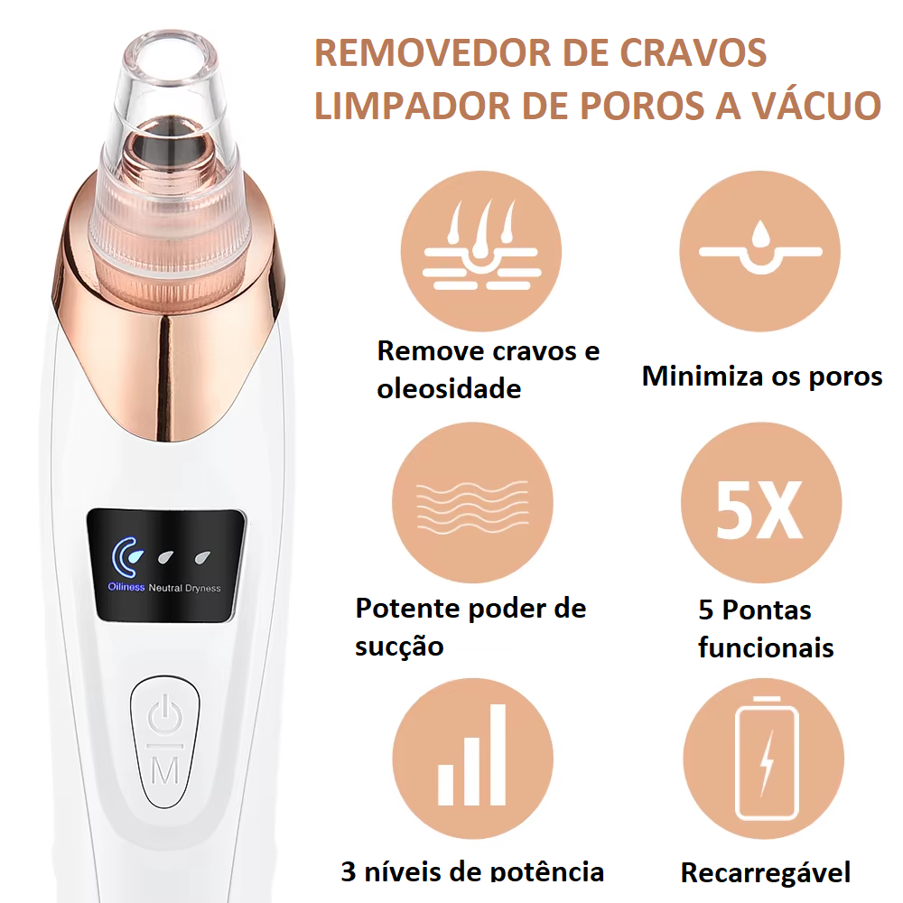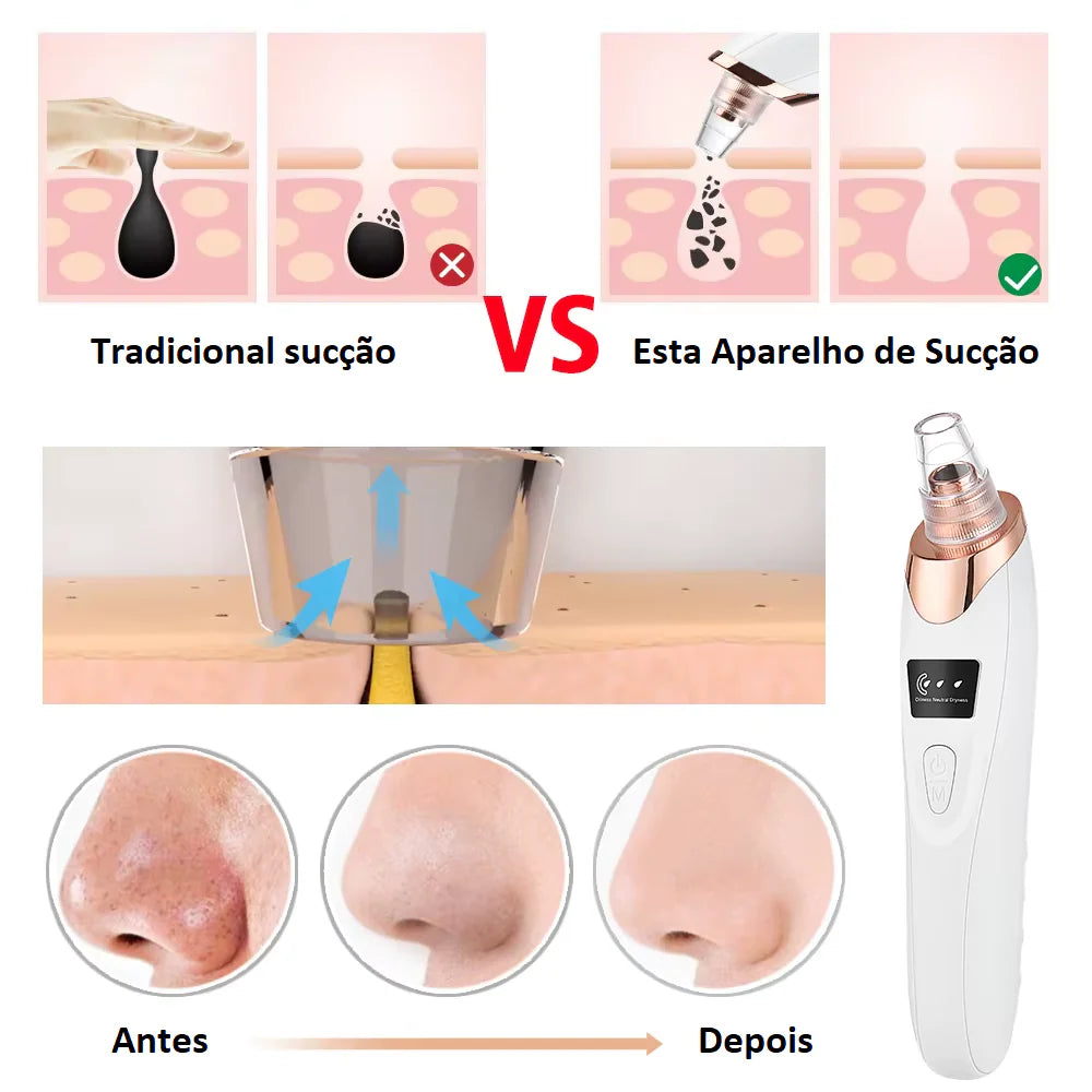 Adota tecnologia inovadora de absorção a vácuo aprimorada para uma sucção super forte que remove sem esforço cravos, espinhas, pele morta, resíduos de maquiagem, acne e pústulas sem agredir a pele, sem irritação e indolor, evitando efeitos colaterais